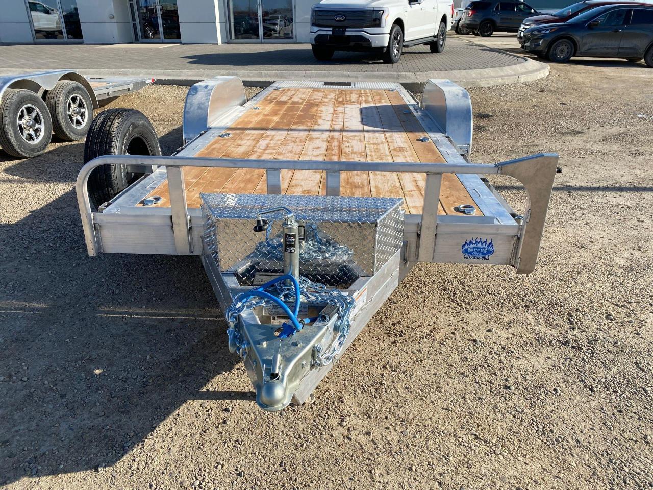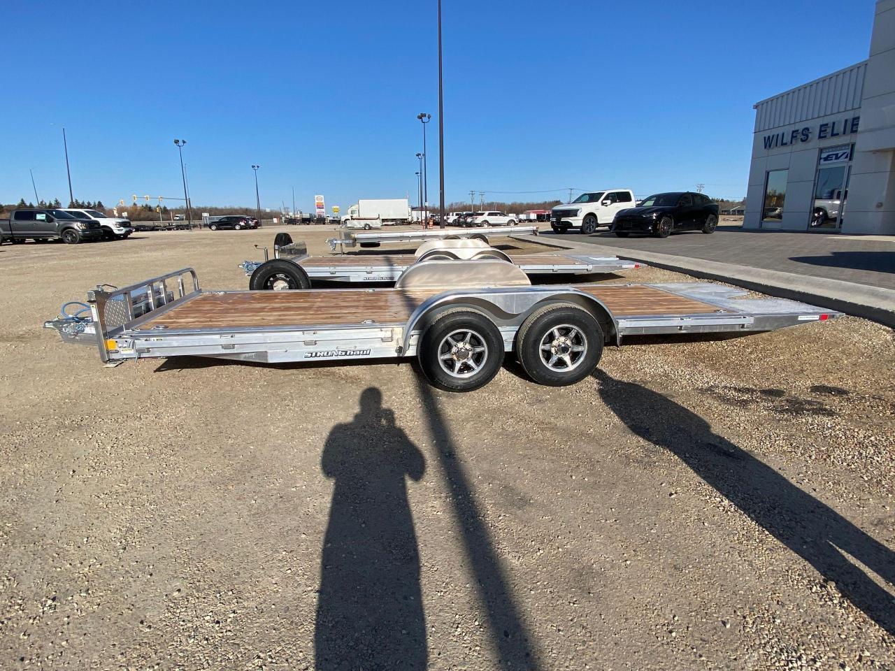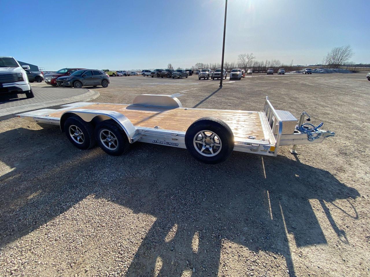 18' + 3' Stronghaul tandem gravity tilt deck car hauler, 19" ride height, 9.5 degree load angle,, 3' knife edge, all aluminum frame, tandem 5200 lb spring axles with brakes, 2 5/16 ball coupler, 15” Radial tires, 7 way rv style connector, junction box/break-away kit with charger, LED lighting, enclosed wiring, 5000 lb jack, 2 x 10 douglas fir/larch plank floor, 3/8” safety chains, 8 4000 lb D rings, rub rail, spare tire mount, aluminum wheel upgrade with matching spare, A-frame tool box. Stock # HH4969. For more info call Wilf’s Elie Ford toll free 877-360-3673. Dealer # 0521.