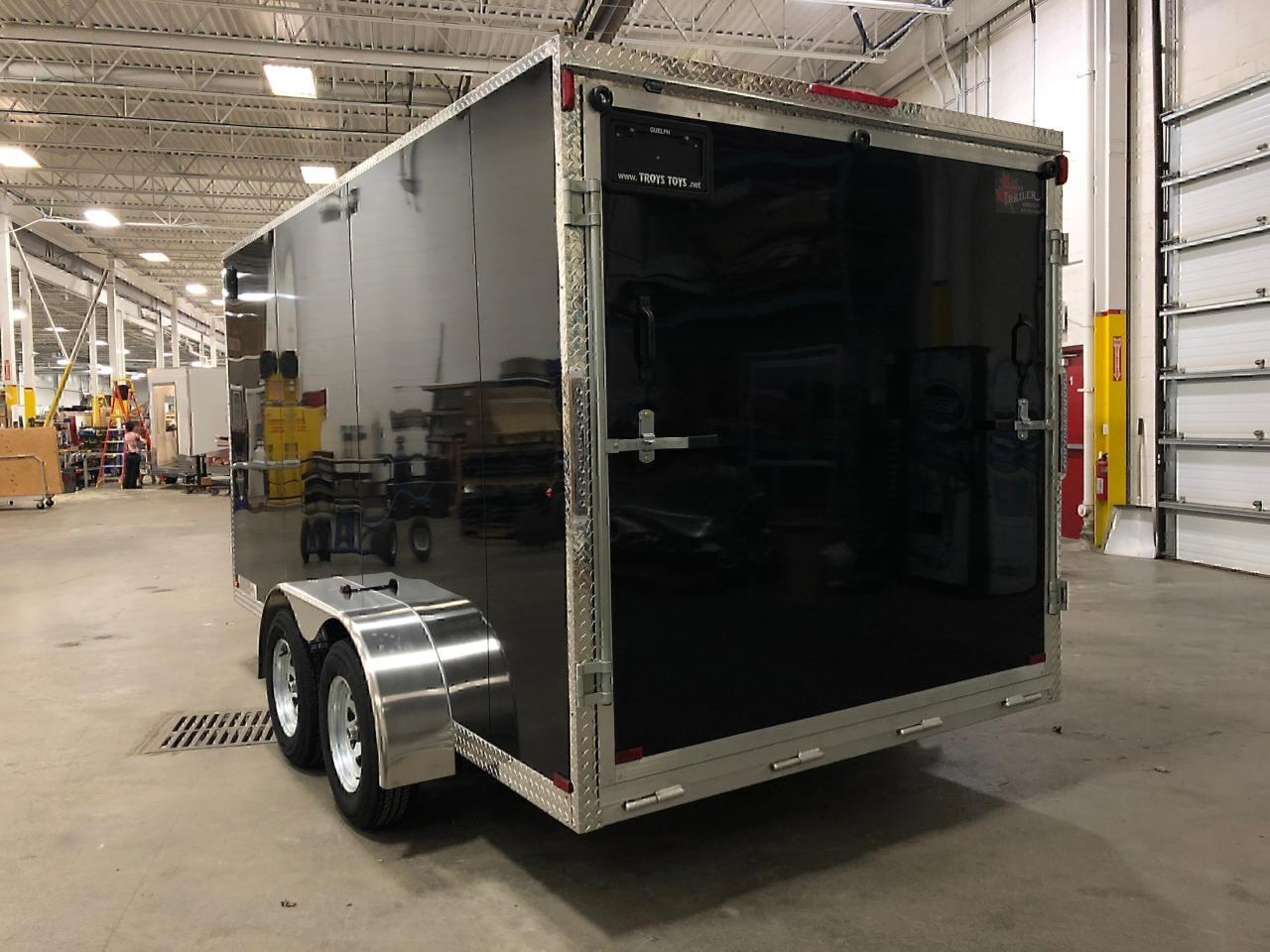Text or Call 519-400-6666 for quick response! Canadian Built Trailers - Cargo Trailers Custom build your trailer at Troys Toys today! Visit our website www.troystoys.net for full inventory. OVER 100 TRAILERS IN STOCK!! *Prices do not include sales tax or registration* This Model: 2019 CTC 7X14 V-Nose (Size does not include the v-nose; size plus the v-nose) HEIGHT: 6'6" COLOUR: Black FRAME: Aluminum REAR DOOR: Ramp Door (W/ Spring Assist) 15 RADIAL TIRES ON: 15 Galvanized Wheels AXLE(S) TYPE: Tandem, dropped AXLE(S) CAPACITY: 3500lb/ea HITCH: 2 5/16 Ball OTHER OPTIONS: RV Latch Standard Options with all CTC Trailers: Screwless exterior cladding (.30) with checker plate trim all around Polished aluminum fenders One piece aluminum roof Angled diamond checker plate stone guard on v-nose 16 o/c square tubing frame (Roof, Walls & Floor) Curb-side man-door 3/4 fir plywood floor 3/8 fir plywood on walls Exterior L.E.D lighting Side Vents Bar Lock For the full 2019 Canadian Trailer Company Lineup, please visit www.canadiantrailercompany.net All trailers come with a 3-year manufacturers warranty. Some conditions apply. See store for details.