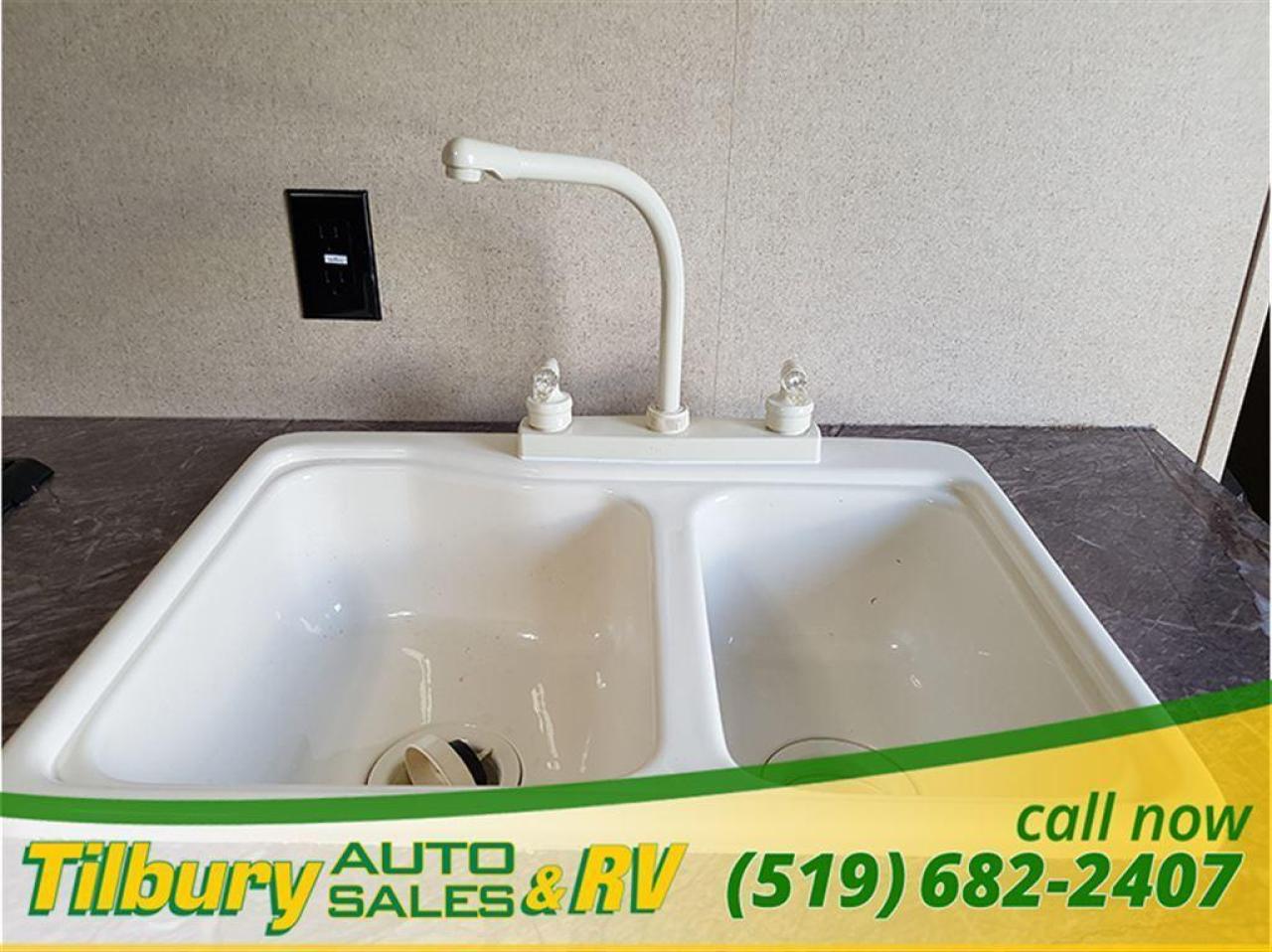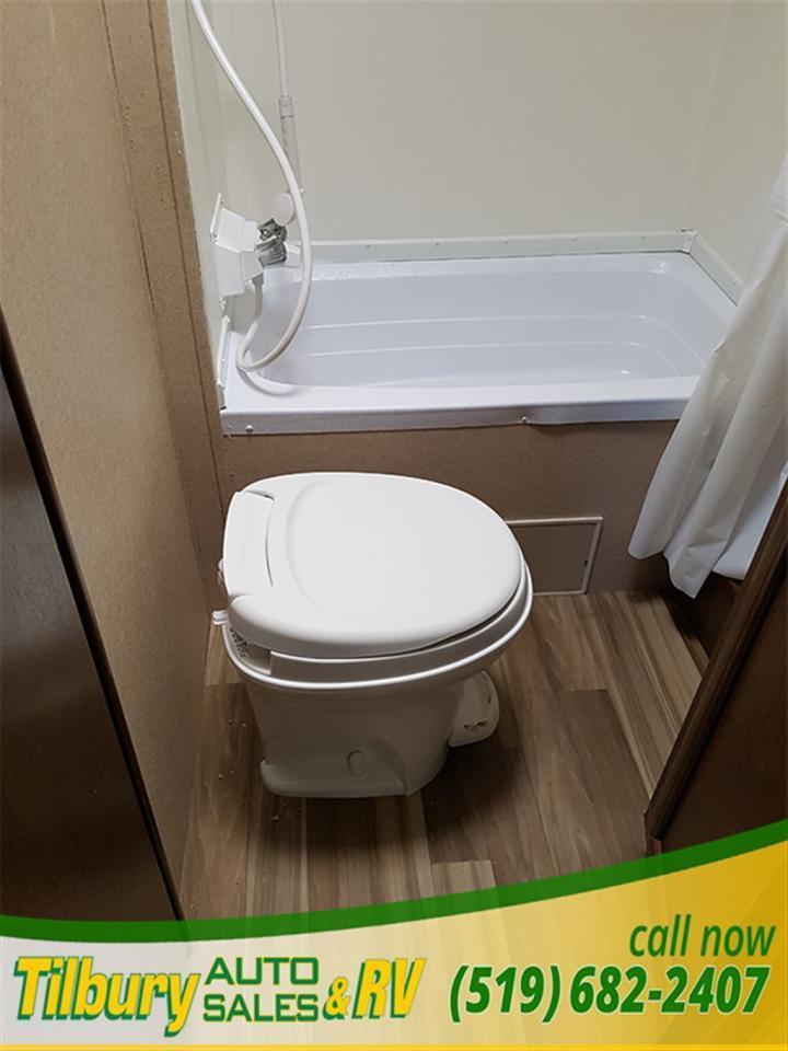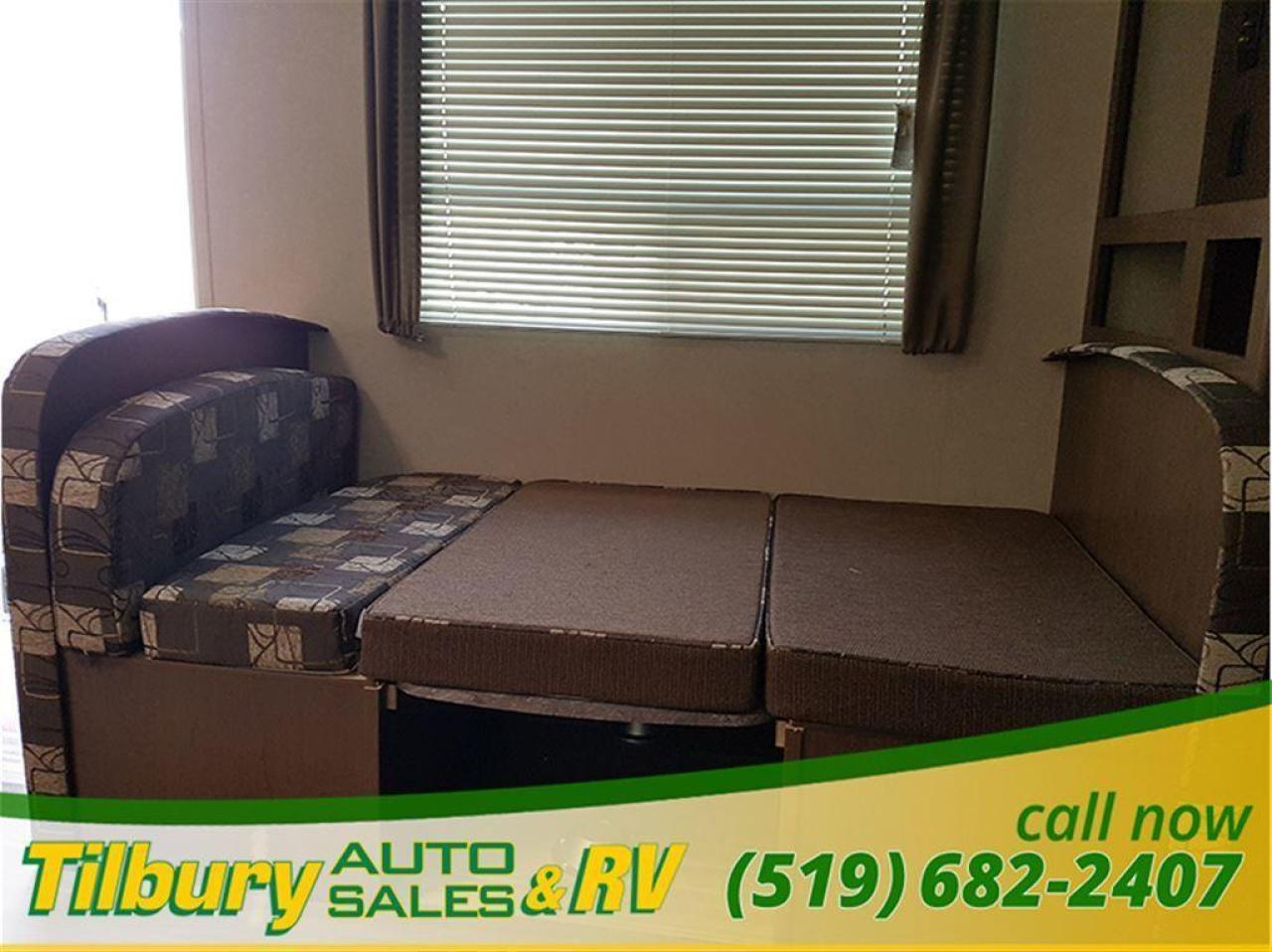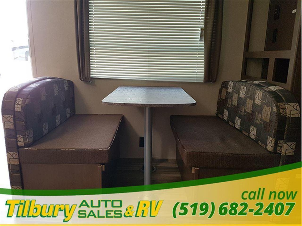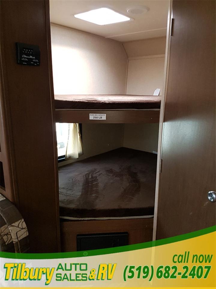 17 ft awning, power outlets, rock-guard, dual propane tanks. Inside you have a kitchen along the bedroom wall. opening up a mid living space. A dinette booth sits across from the sofa that folds into a bed. There is also a space to mount a TV. Towards the rear you will find double bunks and a rear bath with a shower / tub.