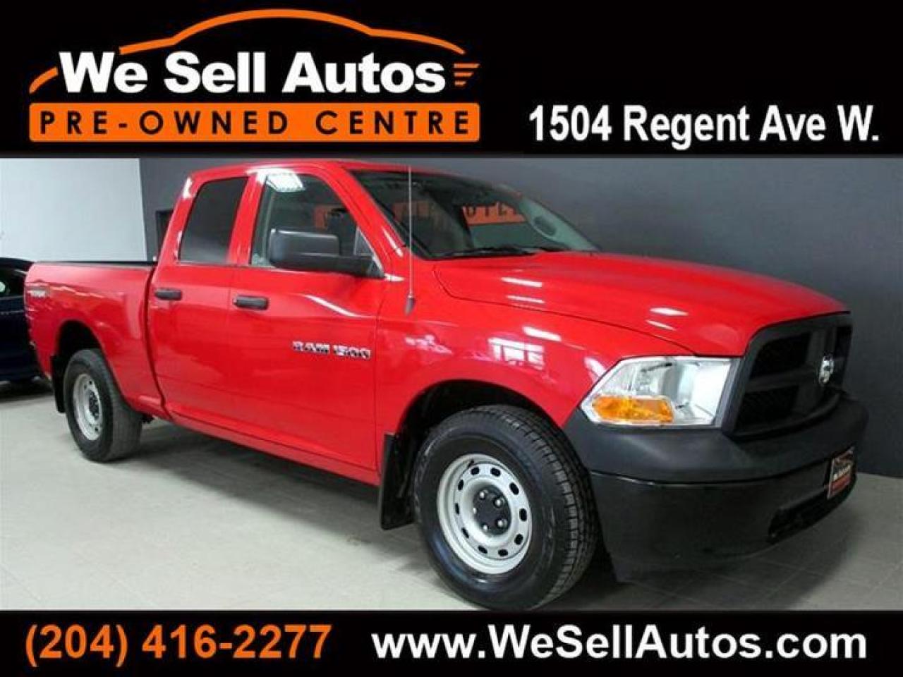 *Cash $20788.00. Finance $19788.00. At We Sell Autos we have over 400 pre-owned vehicles, and we guarantee the lowest prices in Manitoba!!! This 2012 Dodge Ram 1500 ST 4x4 is equipped with Power Windows, Power Door Locks, Alloy Wheels, and much more. This vehicle has only been registered in Manitoba. All our vehicles have passed a Manitoba safety inspection and come with a FREE CarProof vehicle history report. Trade-ins welcome. Competitive finance rates with $0 down payment (OAC). View our entire inventory at www.WeSellAutos.com. Or come see us today at 1504 Regent Ave W. To book a test drive call (204) 416-2277. We Sell Autos - A Division of Donvito Automotive Group. Price does not include GST & PST. Dealer Permit #4612