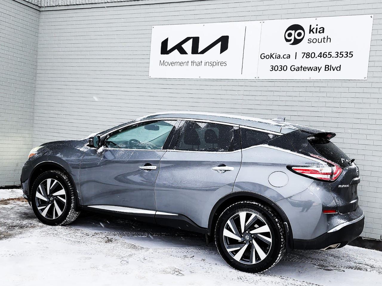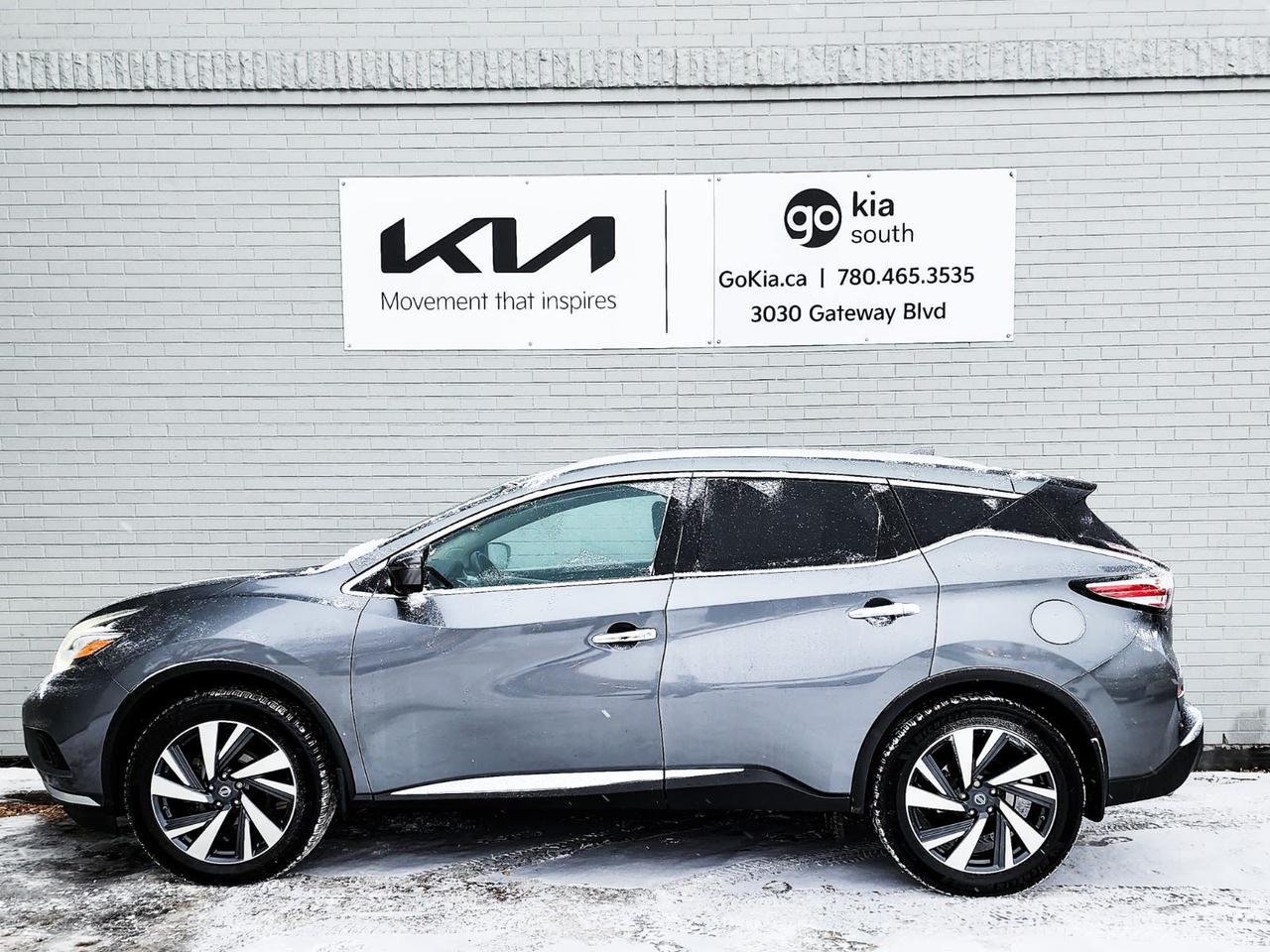 Recent Arrival! 2018 Nissan Murano Platinum AWD CVT with Xtronic 3.5L 6-Cylinder DOHC 24VCVT with Xtronic, AWD, 4.677 Axle Ratio, 4-Wheel Disc Brakes, ABS brakes, Active Cruise Control, Air Conditioning, Alloy wheels, AM/FM radio: SiriusXM, Apple CarPlay/Android Auto, Automatic temperature control, Block heater, Brake assist, Bumpers: body-colour, CD player, Child-Seat-Sensing Airbag, Compass, Delay-off headlights, Driver door bin, Driver vanity mirror, Dual front impact airbags, Dual front side impact airbags, Electronic Stability Control, Four wheel independent suspension, Front anti-roll bar, Front Bucket Seats, Front dual zone A/C, Front fog lights, Front reading lights, Full Tank of Fuel & Floor Mats, Fully automatic headlights, Heated door mirrors, Heated front seats, Heated steering wheel, Illuminated entry, Knee airbag, Leather Appointed Seat Trim, Low tire pressure warning, Navigation System, Occupant sensing airbag, Outside temperature display, Overhead airbag, Overhead console, Panic alarm, Passenger vanity mirror, Power door mirrors, Power driver seat, Power Liftgate, Power moonroof, Power steering, Power windows, Radio data system, Radio: AM/FM/CD Audio w/NissanConnect Navigation, Rear anti-roll bar, Rear reading lights, Rear window defroster, Rear window wiper, Remote keyless entry, Roof rack: rails only, Security system, Speed control, Speed-sensing steering, Speed-Sensitive Wipers, Split folding rear seat, Spoiler, Steering wheel mounted audio controls, Tachometer, Telescoping steering wheel, Tilt steering wheel, Traction control, Trip computer, Turn signal indicator mirrors, Variably intermittent wipers.Reviews: * Most owners enjoy the Murano's upscale styling, upscale cabin, feature content bang for the buck and solid, comfortable, and confident ride. Feature content favourites include the Bose stereo system and panoramic sunroof. Many say they appreciate the added traction of the Murano's fully automatic AWD system in inclement weather, too. By and large, Murano seems to have satisfied the needs of many shoppers after an upscale crossover driving experience at a reasonable price. Source: autoTRADER.caIN HOUSE FINANCING, IN HOUSE LEASING AVAILABLE O.A.C.If you are interested and need more information call or message our sales team, we will be glad to help you now!!Our knowledgeable sales staff will help assist you with every step. To book a test drive or receive further information give us a call at (780)-465-3535 or email us: kiahmed@gokia.caAt Go Kia, were happy to help! Proudly serving Edmonton and all of Alberta including St. Albert, Wetaskiwin, Fort McMurray, Grande Prairie, Drayton Valley, Nisku, Leduc, Rimby, Hinton, St. Paul, Lloydminster, Edson, and all of Western Canada!An AMVIC Licensed Business. Value Priced vehicles are aggressively priced and may require some additional mechanical or cosmetic repairs, all disclosed on a Vehicle Assessment Report!This vehicle may be leased or financed by anyone*, however, due to the recent increase in fraudulent vehicle purchase activity, Go Kia reserves the right to decline a transaction on suspicion of non-retail intentions including but not limited to wholesaling or exporting.*on approved credit, see dealer for detailsIN HOUSE FINANCING, IN HOUSE LEASING AVAILABLE O.A.C.If you are interested and need more information call or message our sales team, we will be glad to help you now!!Our knowledgeable sales staff will help assist you with every step. To book a test drive or receive further information give us a call at (780)-465-3535 or email us: kiahmed@gokia.caAt Go Kia, were happy to help! Proudly serving Edmonton and all of Alberta including St. Albert, Wetaskiwin, Fort McMurray, Grande Prairie, Drayton Valley, Nisku, Leduc, Rimby, Hinton, St. Paul, Lloydminster, Edson, and all of Western Canada!An AMVIC Licensed Business. Value Priced vehicles are aggressively priced and may require some additional mechanical or cosmetic repairs, all disclosed on a Vehicle Assessment Report!This vehicle may be leased or financed by anyone*, however, due to the recent increase in fraudulent vehicle purchase activity, Go Kia reserves the right to decline a transaction on suspicion of non-retail intentions including but not limited to wholesaling or exporting.*on approved credit, see dealer for details