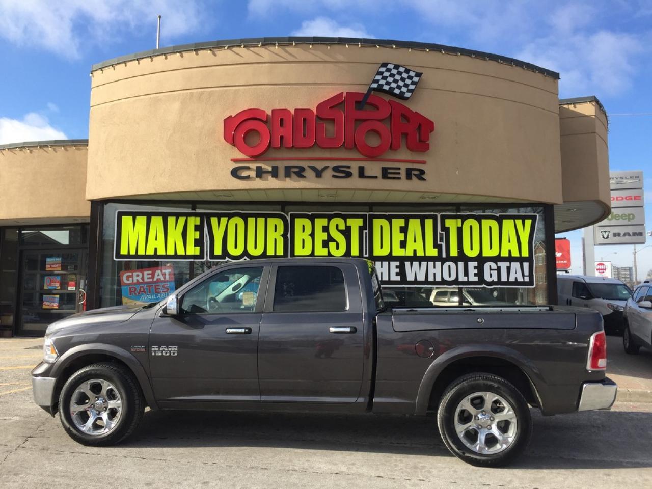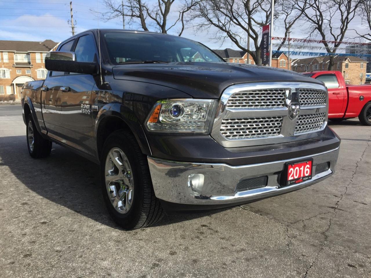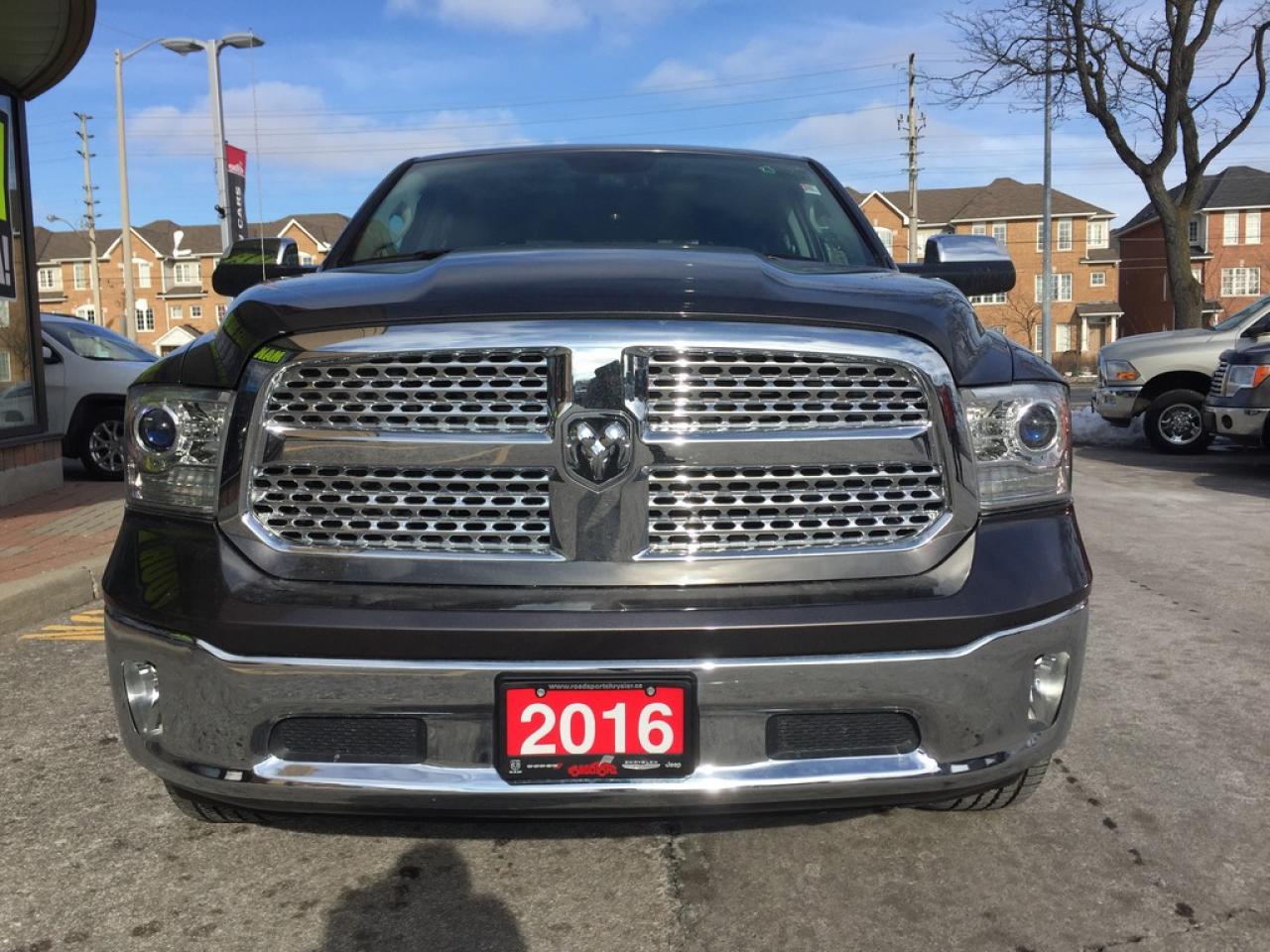 **2016 RAM 1500 LARAMIE CREW CAB. 5.7L V8 HEMI, WITH THE LARGER 6.4INCH BED, 8 SPEED AUTOMATIC TRANSMISSION, PUSH BUTTON START, REMOTE START, REAR CAMERA, TRAILER TOW MIRRORS, HEATED FRONT SEATS, HEATED STEERING WHEEL, VENTILATED SEATS.POWER SUNROOF AND MUCH MORE.. FORMER DAILY RENTAL..VEHICLE LOCATED AT ROADSPORT CHRYSLER 2851 EGLINTON AVENUE EAST TORONTO ONTARIO 416-264-2501.