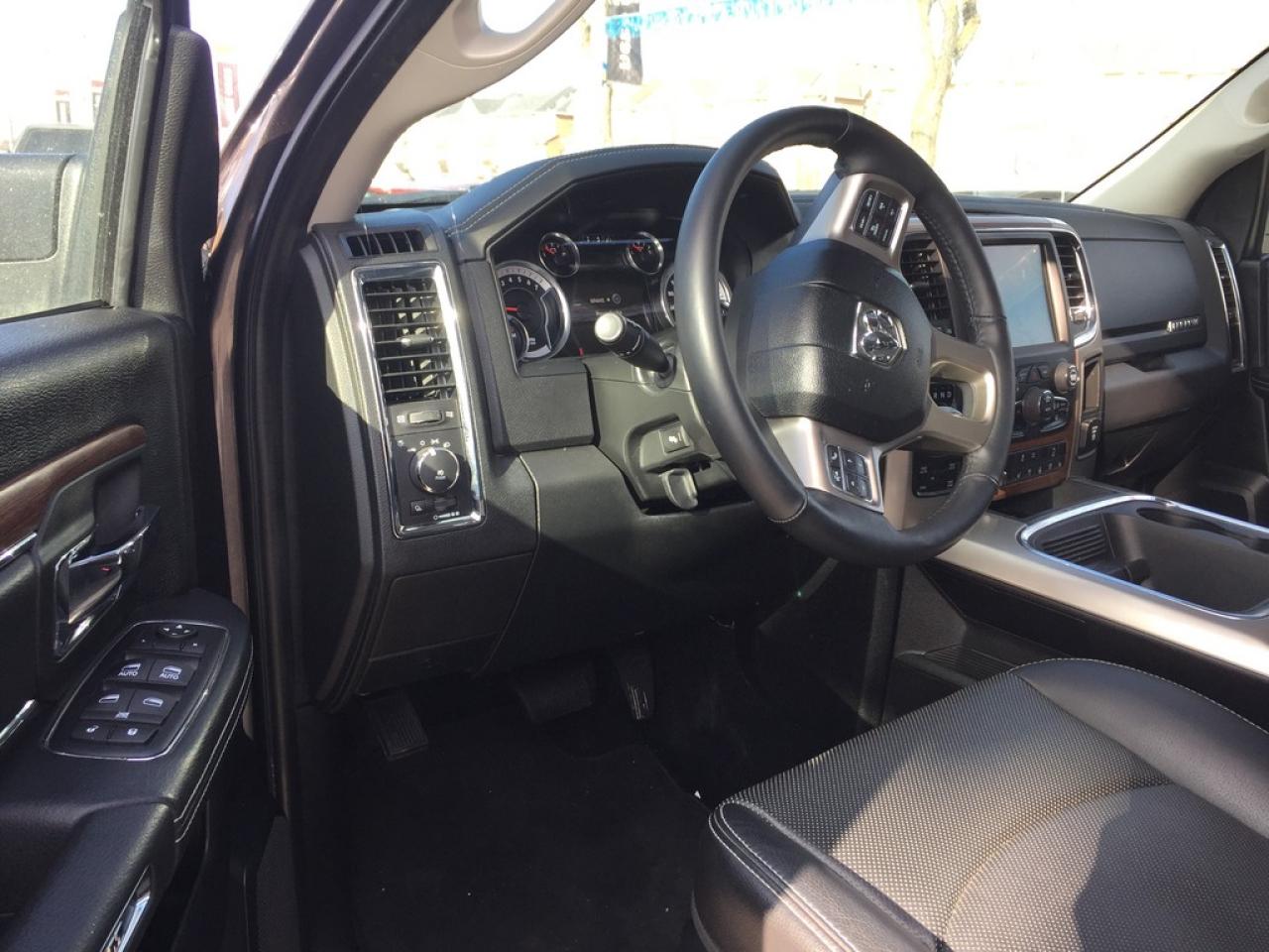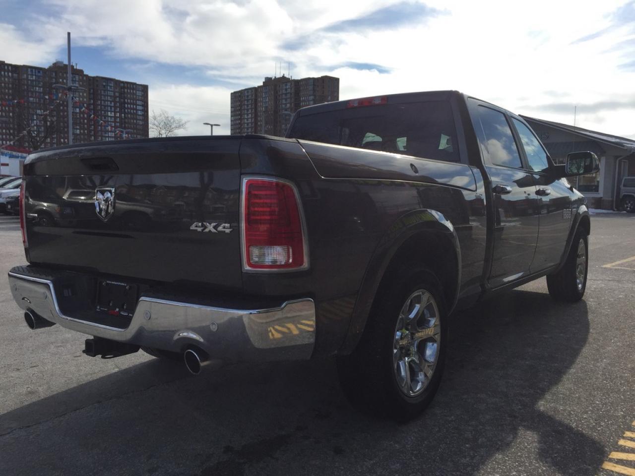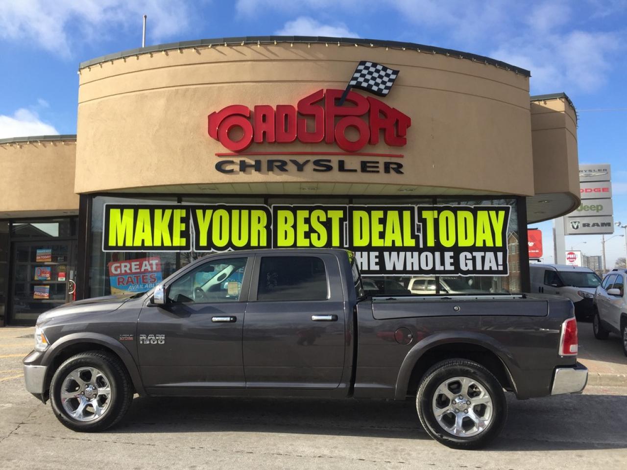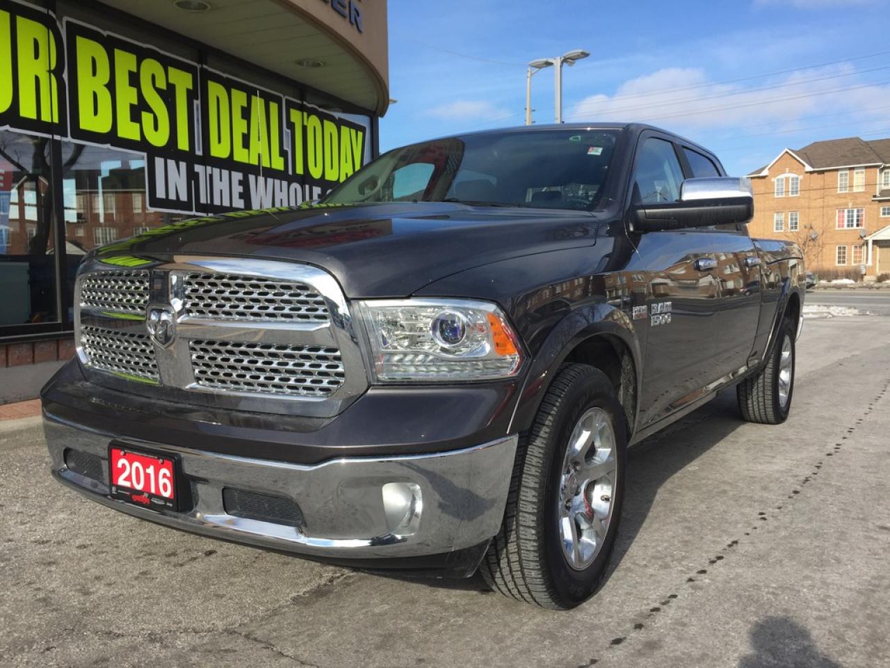 **2016 RAM 1500 LARAMIE CREW CAB. 5.7L V8 HEMI, WITH THE LARGER 6.4INCH BED, 8 SPEED AUTOMATIC TRANSMISSION, PUSH BUTTON START, REMOTE START, REAR CAMERA, TRAILER TOW MIRRORS, HEATED FRONT SEATS, HEATED STEERING WHEEL, VENTILATED SEATS.POWER SUNROOF AND MUCH MORE.. FORMER DAILY RENTAL..VEHICLE LOCATED AT ROADSPORT CHRYSLER 2851 EGLINTON AVENUE EAST TORONTO ONTARIO 416-264-2501.
