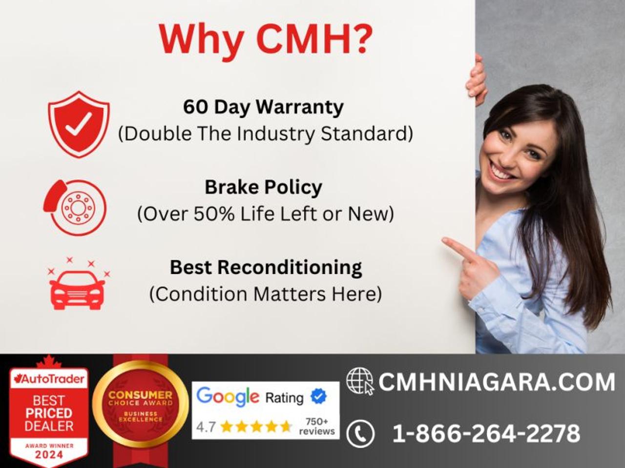 Trade-ins are welcome! Financing available OAC ! Price INCLUDES a valid safety certificate! Price INCLUDES a 60-day limited warranty on all vehicles except classic or vintage cars. CMH is a Full Disclosure dealer with no hidden fees. We are a family-owned and operated business for over 30 years! o~o