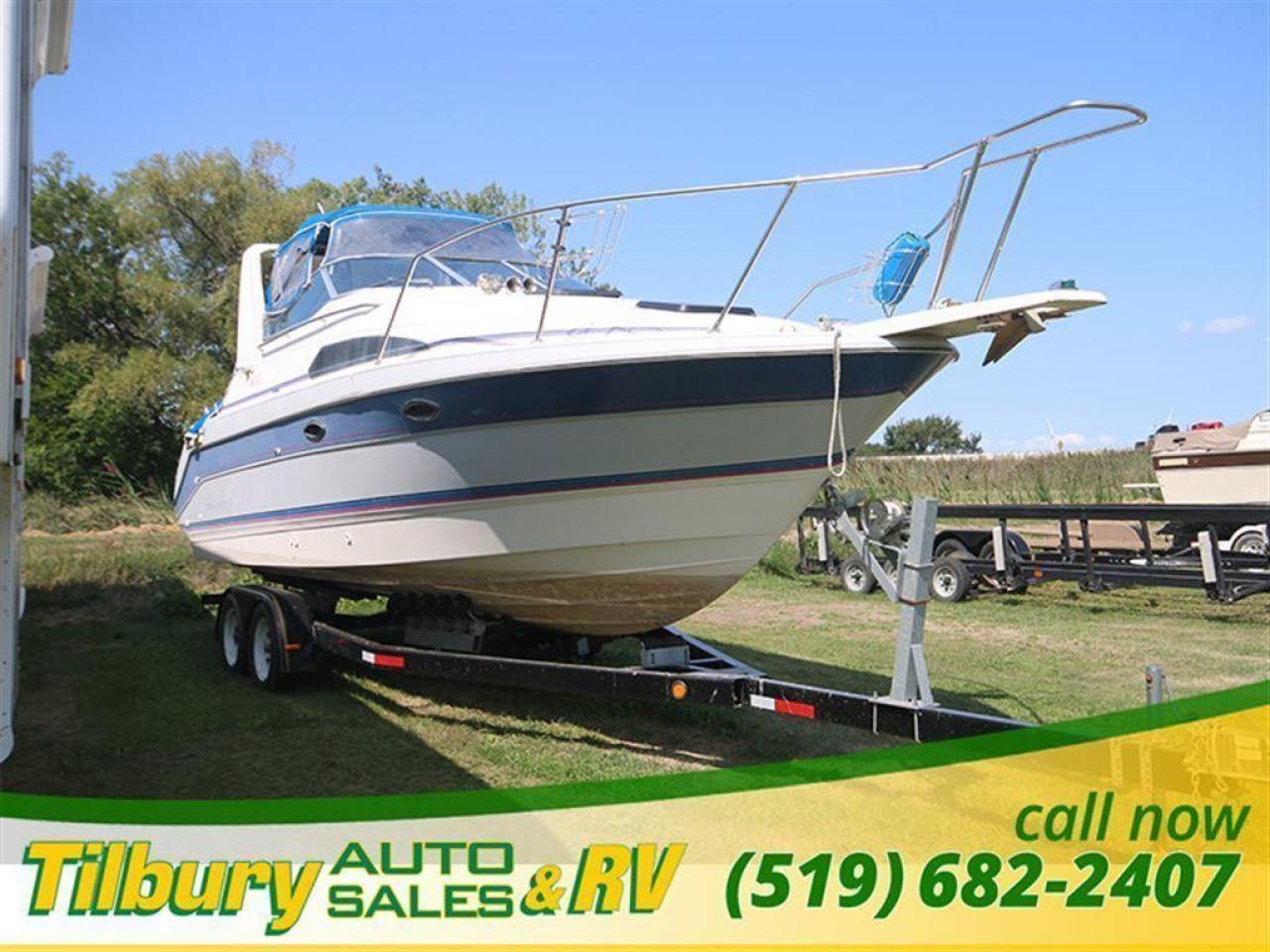 Enjoy cruising around on the lake in the 27 foot Bayliner sunbridge 2755. This boat does need a deep cleaning, but the potenital is quite clear to see. This boat can MOVE - with a 5.8 Ford Cobra Motor installed, you won't stay put in one place long. This comes with a bathroom, toilet, shower, 2 full sinks (one in the bottom and one on the top deck), and a mini fridge. Has an entertainment unit installed. Full seating underneath the boat (dinette kitchen area) that can be turned into a flat bed sleeping area. Tons of space under here - can comfortably stand if you're under 5'10. Tanning area in the front part of the boat. Canopy included for additional shade. 27 Feet long.