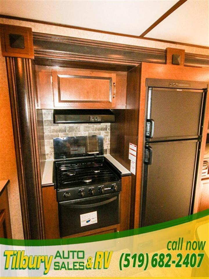 The U shaped dinette transfers into extra sleeping space or a couch, right across the trailer there is an entertainment center with a flat screen tv and built in stereo, the kitchen includes a center island, fridge/stove, cooktop/oven, microwave, and big tub sink.