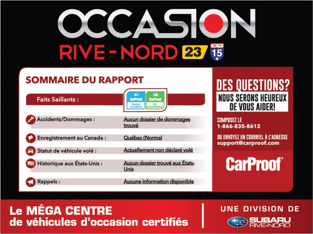 JAMAIS ACCIDENTÉ! Un seul propriétaire! Repris en échange d'un de nos clients, ne provient pas de l'encan. INSPECTION SÉCURITAIRE FAITE! Pour une conduite en toute sécurité, digne d'un vrai concessionnaire de confiance. Conditions en succursale. ACCIDENT FREE! One owner! Trade in, not an auction vehicle. SAFETY INSPECTION DONE! For safe driving, worthy of a real dealer of confidence. Conditions in store. 2013 Hyundai Santa Fe Sport. Automatique, Bluetooth, Caméra de recul, Intérieur en cuir, Toit ouvrant panoramique, Jantes en alliage, Phares antibrouillards, Sièges électriques chauffants, Air climatisé, Régulateur de vitesse, Groupe électrique, Lecteur CD/MP3/AUX/USB/Sirius/XM, Anti-patinage, Tout équipé et Très propre! Kilométrage vérifié. Balance de garantie valide jusqu'au 2 avril 2018 ou 100 000 km. Garantie supplémentaire disponible. Mécanique et esthétique WOW! Conditions en succursale! 2013 Hyundai Santa Fe Sport. Automatic, Bluetooth, Back-up camera, Leather interior, Panoramic Sunroof, Alloy wheels, Fog lights, Heated and electric seat, Air conditioning, Cruise Control, PowerGroup, CD/MP3/AUX/USB/Sirius/XM, Traction control, Fully equipped and Very clean! Verified mileage. Warranty valid until April 2nd, 2018 or 100 000km. Additional warranty available. Mechanically and aesthetically WOW! Conditions in store! PLUS DE 200 VÉHICULES D'OCCASION EN INVENTAIRE. Nos hauts standards de qualité, un très large inventaire, le meilleur rapport qualité/prix et une approche sans pression font de Subaru Rive-Nord et Occasion Rive-Nord des valeurs sûres pour l'achat de votre prochain véhicule d'occasion! MORE THEN 200 PRE-OWNED VEHICLES IN STOCK. Our high quality standard, a very large inventory, best quality/price ratio and no pressure approach make Subaru Rive-Nord and Occasion Rive-Nord a safe bet for the purchase of your next pre-owned vehicle! WWW.SUBARURIVENORD.COM