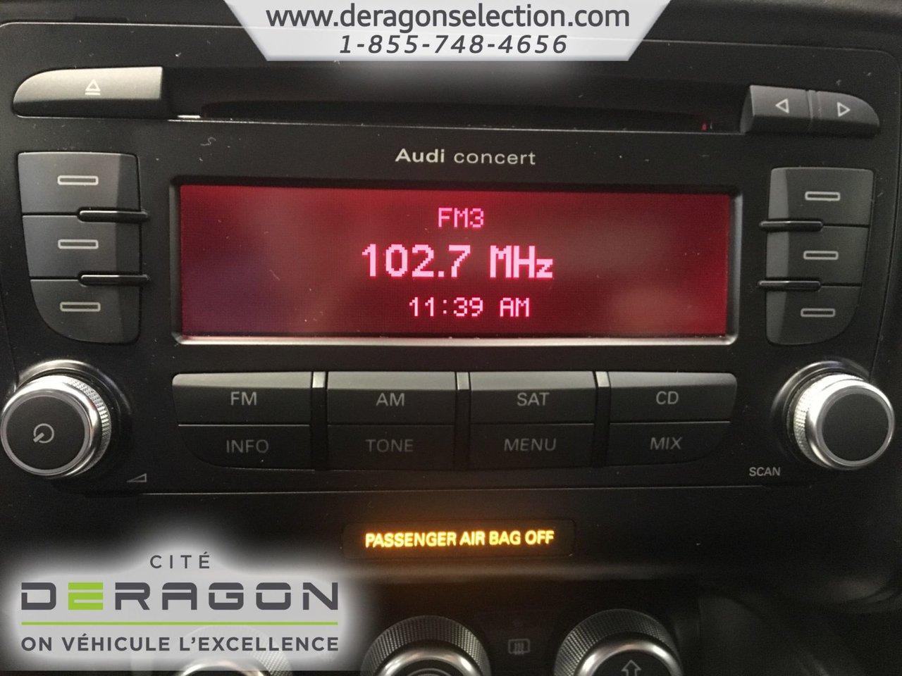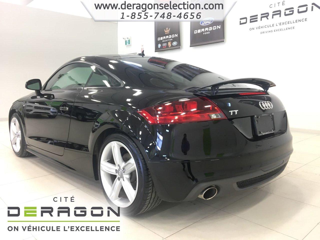 Audi TT 2.0T COUPE S LINE + QUATTRO + CUIR 2.0T COUPE S LINE + QUATTRO + CUIR 2012Régulateur de vitesse, Essuie-glaces intermittents, Freins ABS, Contrôle de stabilité, Coussin gonflable conducteur, Coussins gonflables latéraux, Lecteur CD, Lecteur MP3, Portes électriques, Sièges électriques, Tachymètre, Vitres électriques, Air climatisé, Intérieur en cuir, Climatisation deux zones, Commandes audio au volant, Sièges arrières rabattables, Sièges chauffants, Volant ajustable, Aileron, Tapis protecteurs, Ordinateur de bord, Tout équipé, Radio AM/FM, Phares automatiques, Rétroviseur électrique, Direction assistée, Télédéverrouillage, Rétroviseurs chauffants, Siège à réglage électrique, Système d\'alarme, Freins à disque, Sièges chauffants - Avant, Rétroviseurs électriques, Jantes en alliage, Antipatinage, Phares antibrouillards, Système de surveillance de la pression des pneus, Sièges baquets, Climatiseur automatique, Rétroviseur à atténuation automatique, Aluminium, Climatisation
