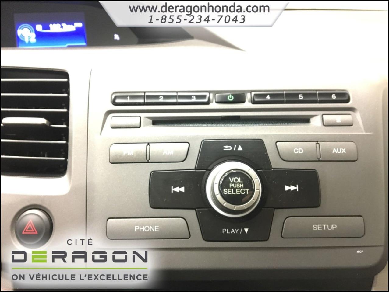 Honda Civic LX 1.8L + A/C + BLUETOOTH + D?MARREUR ? DISTANCE LX 1.8L+A/C+BLUETOOTH+D?MARREUR ? DISTANCE+R?GULATEUR DE VITESSE 2012Régulateur de vitesse, Essuie-glaces intermittents, Anti-démarreur, Freins ABS, Contrôle de stabilité, Coussin gonflable conducteur, Coussins gonflables latéraux, Démarreur à distance, Lecteur CD, Lecteur MP3, Tachymètre, Vitres électriques, Air climatisé, Commandes audio au volant, Lampes de lecture arrière, Volant ajustable, Enjoliveurs, Tapis protecteurs, Radio AM/FM, Phares automatiques, Rétroviseur électrique, Direction assistée, Télédéverrouillage, Rétroviseurs chauffants, Coussins gonflables arrière pour la tête, Sièges tissu, Freins à disque, Rétroviseurs électriques, Antipatinage, Verrous de sécurité pour enfants, Sièges baquets, Technologie Bluetooth intégrée, Climatisation