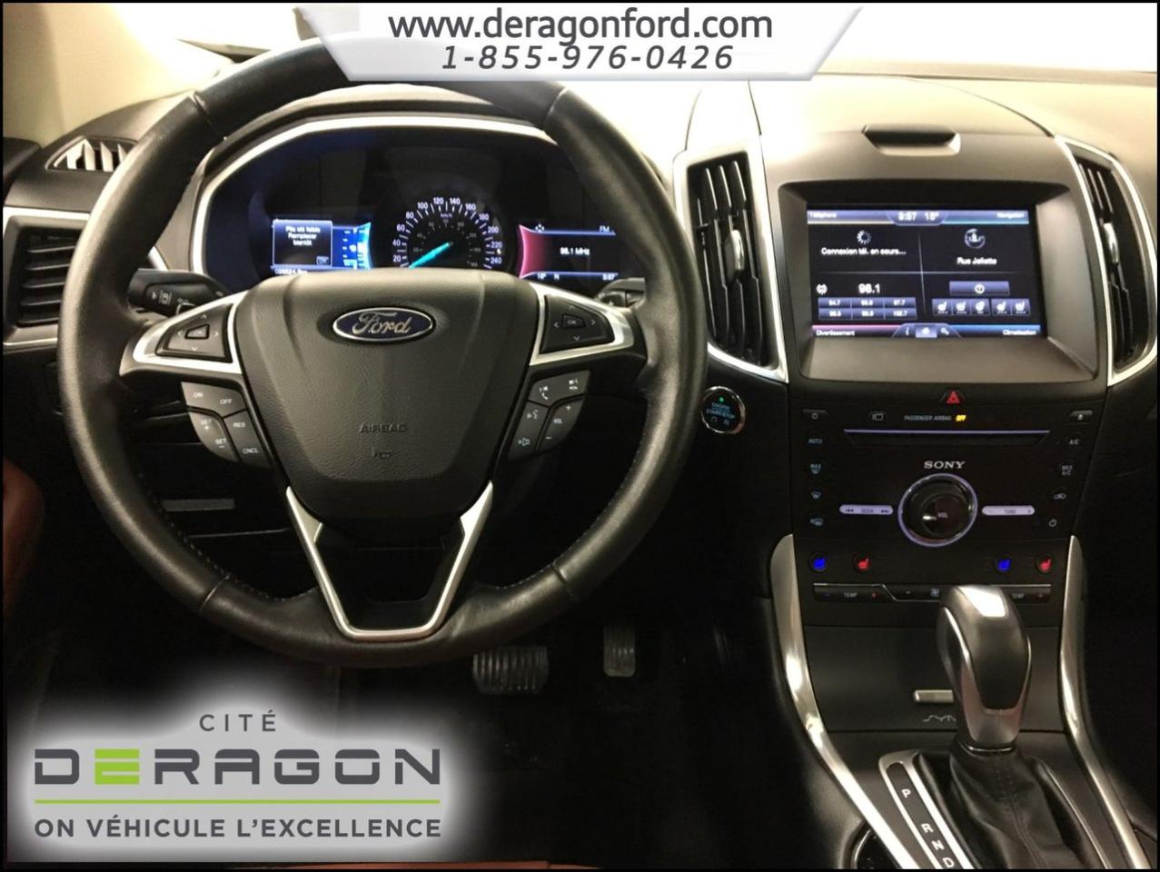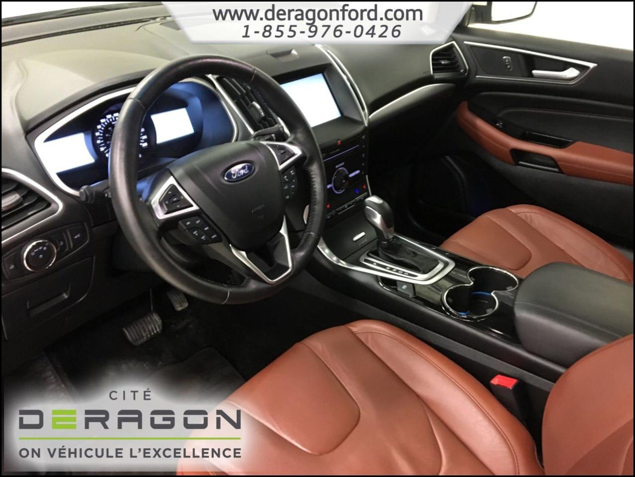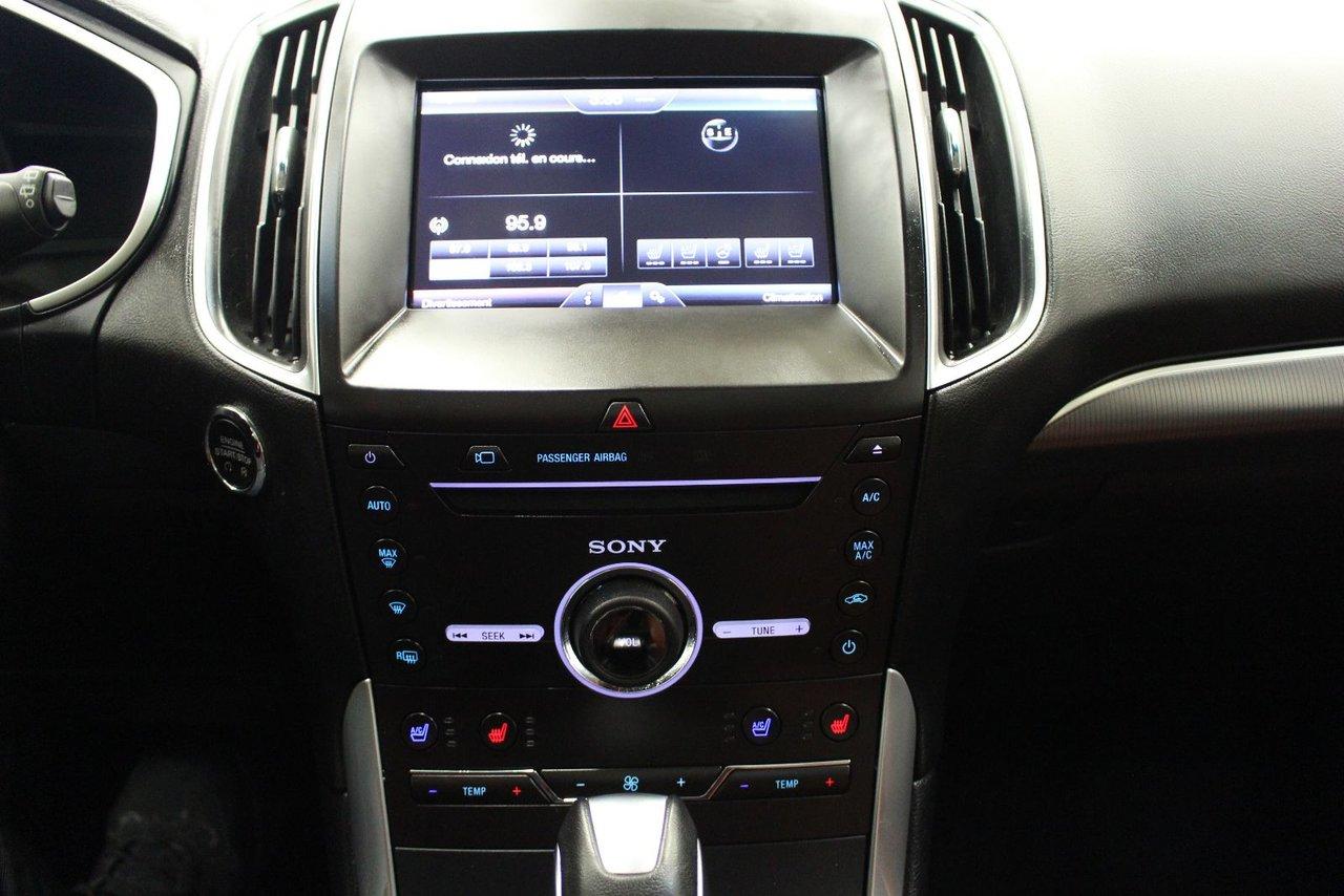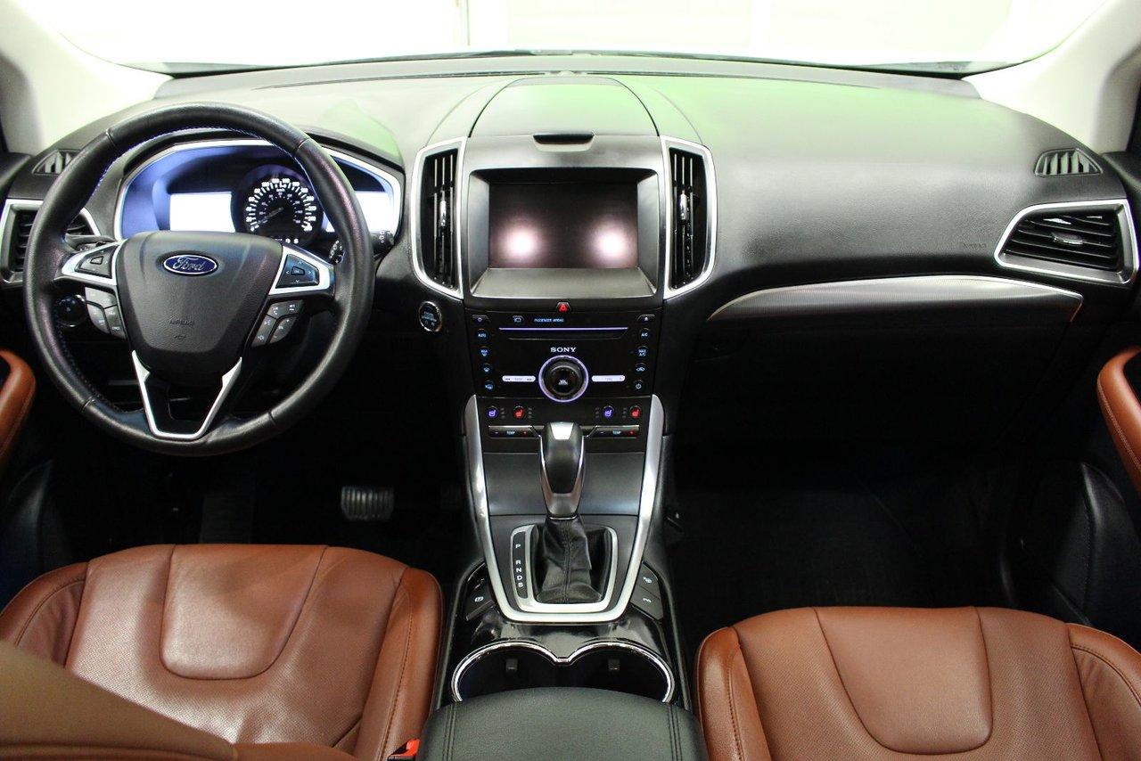 Ford Edge TITANIUM + AWD + TOIT + NAVIGATION TITANIUM + AWD + TOIT + NAVIGATION 2015Régulateur de vitesse, Toit ouvrant, Essuie-glaces intermittents, Essuie-glace arrière, Anti-démarreur, Freins ABS, Contrôle de stabilité, Coussin gonflable conducteur, Coussins gonflables latéraux, Démarreur à distance, Lecteur CD, Lecteur MP3, 8 Haut-parleurs, Portes électriques, Sièges électriques, Tachymètre, Vitres électriques, Air climatisé, Intérieur en cuir, Climatisation deux zones, Commandes audio au volant, Sièges arrières rabattables, Sièges chauffants, Siège mémoire, Volant ajustable, Aileron, Tapis protecteurs, Vitres teintées, Phares haute intensité, Ordinateur de bord, Tout équipé, Caméra de recul, Radio AM/FM, Rétroviseurs, Volant gainé de cuir, Phares automatiques, Rétroviseur électrique, Sièges arrières chauffants, Direction assistée, Télédéverrouillage, Rétroviseurs chauffants, Banquette arrière divisé, Siège à réglage électrique, Système d\'alarme, Coussins gonflables arrière pour la tête, Siège conducteur - soutien lombaire, Siège passager - soutien lombaire, Essuie-glace détecteur de pluie, Démarrage sans clé, Freins à disque, Sièges chauffants - Avant, Rétroviseurs électriques, Jantes en alliage, Antipatinage, Phares antibrouillards, Verrous de sécurité pour enfants, Système de surveillance de la pression des pneus, Sièges baquets, Technologie Bluetooth intégrée, Port USB, Climatiseur automatique, Aide au stationnement (capteurs), Rétroviseur à atténuation automatique, Aluminium, Climatisation