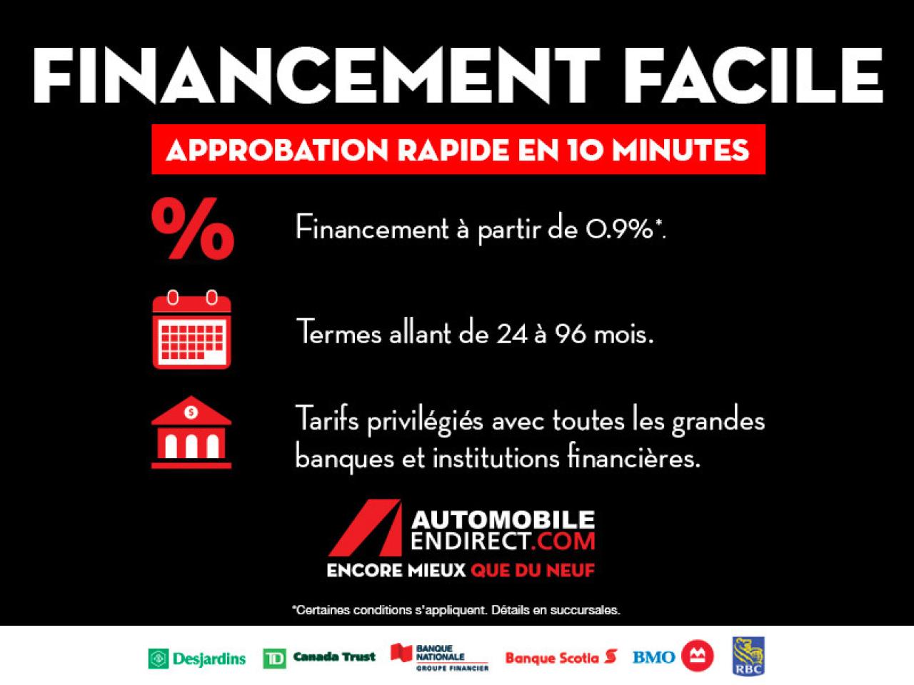 AUDIO SUR LE VOLANT BLUETOOTH BALANCE DE GARANTIE CLIMATISATION GROS ECRAN SIEGES CHAUFFANTS VERROUILLAGE SANS CLE TOUTE EQUIPEE ECONOMIQUE 1200 véhicules - Livraison 24h - Financement facile à partir de 0.9% - Ouvert 7 jours / 5 soirs Automobile en Direct.com c'est le plus gros inventaire de véhicules d'occasion, avec toutes les marques et tous les modèles offert au meilleur prix. C'est aussi profiter de nombreux avantages exclusifs et d'une gamme complète de services offerts en un seul endroit: - Livraison rapide en moins de 24h. - Financement facile sur place à partir de 0.9%. - 2ième et 3ième chance au crédit 100% approuvée. - Allocation incroyable pour vente et échange de véhicule sur place. Au delà des véhicules, Automobile en Direct.com, c'est une équipe de 150 passionnés qui vous accueille dans une ambiance sincère, amicale et courtoise. Il n'y a pas de fla-fla ou de pression inutile. Vous vendez votre véhicule? Nous achetons au meilleur prix même si vous n'achetez pas avec nous. Passez nous voir en magasin ou prenez rendez-vous pour un essai routier. Faites vite. Chaque véhicule est unique. Ce véhicule ne correspond pas exactement à ce que vous recherchez? Visitez Automobile en Direct.com, nous avons accès à toutes les marques et tous les modèles au meilleur prix garanti. Automobile en Direct.com - Encore mieux que du neuf. Automobile en Direct.com is the largest used car inventory with all makes and models offered at the lowest price. They also offer access to exclusive offers and services in one location: - Fast delivery in less than 24 hours. - Easy financing starting at 0.9%. - 2nd and 3rd credit chance 100% approved. - Best value offered for your trade-in. Beyond the vehicles, Automobile en Direct.com is a team of 150 pasionnate people that welcome you in a simple, friendly and nice atmosphere. There is no run-around or pressure when you deal with us. Are you selling your vehicle? We buy at the best price, even if you don't buy with us. Visit us in store or make an appointment for a test drive. Hurry hup, every vehicle is unique. This vehicle does not match exactly with what you want? Visit us at Automobile en Direct.com, we have access to all makes and vehicle at the lowest price guaranteed Automobile en Direct.com - Even better than new.