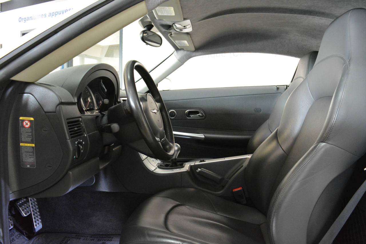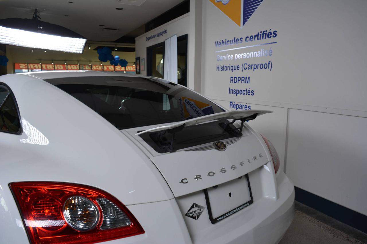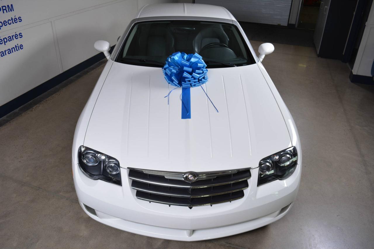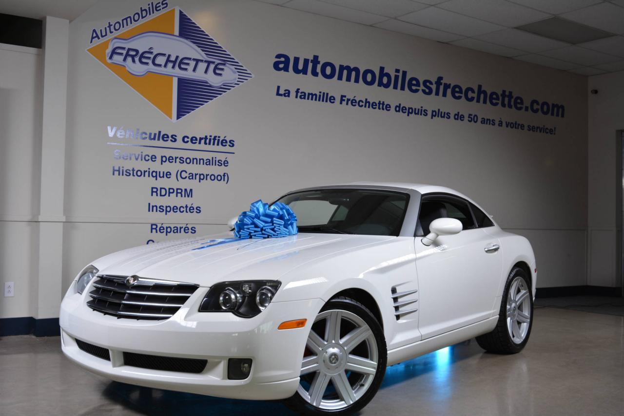 * Inspection complète et esthétique inclus * Crossfire Limited coupé 2 portes * 2 places * Transmission manuelle 6 vitesses * Propulsion arrière * Moteur V6 3.2L * Roues en alliages 18'' avant et 19'' arrière * #Cuir noir# * Sièges électriques chauffants * Rétroviseurs chauffants * Régulateur de vitesse * Climatisation 2 zones * Lecteur CD * Provient d'un client d'Automobiles Fréchette