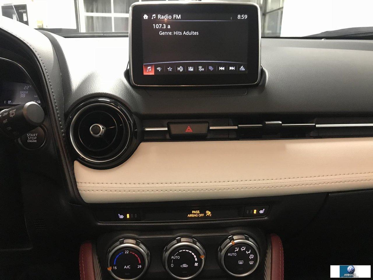 Mazda CX-3 CUIT + TOIT + MAG + GPS GT 4 X 4 + NAVIGATION 2016Régulateur de vitesse, Toit ouvrant, Essuie-glaces intermittents, Anti-démarreur, Freins ABS, Contrôle de stabilité, Coussin gonflable conducteur, Lecteur CD, Lecteur MP3, Miroirs chauffants, Portes électriques, Tachymètre, Vitres électriques, Air climatisé, Intérieur en cuir, Commandes audio au volant, Sièges chauffants, Volant ajustable, Aileron, Tapis protecteurs, Ordinateur de bord, Caméra de recul, Horloge, Radio AM/FM, Direction assistée, Télédéverrouillage, Essuie-glace détecteur de pluie, Rétroviseurs électriques, Jantes en alliage, Antipatinage, Phares antibrouillards, Coussins gonflables, Verrous de sécurité pour enfants, Système de surveillance de la pression des pneus, Dégivreur de lunette arrière, Miroirs ajustables de l\'intérieur, Sièges baquets, Technologie Bluetooth intégrée, Climatiseur automatique