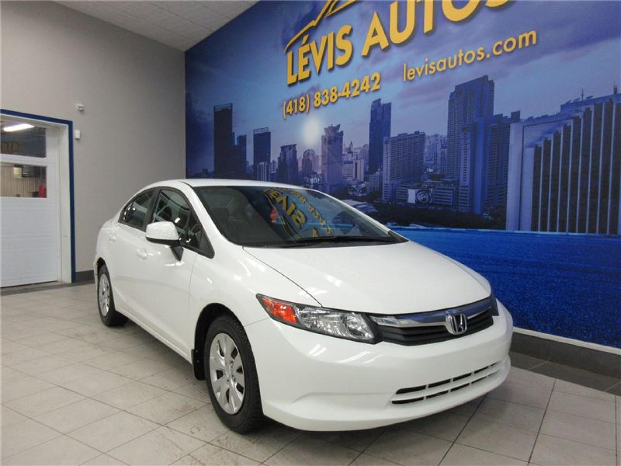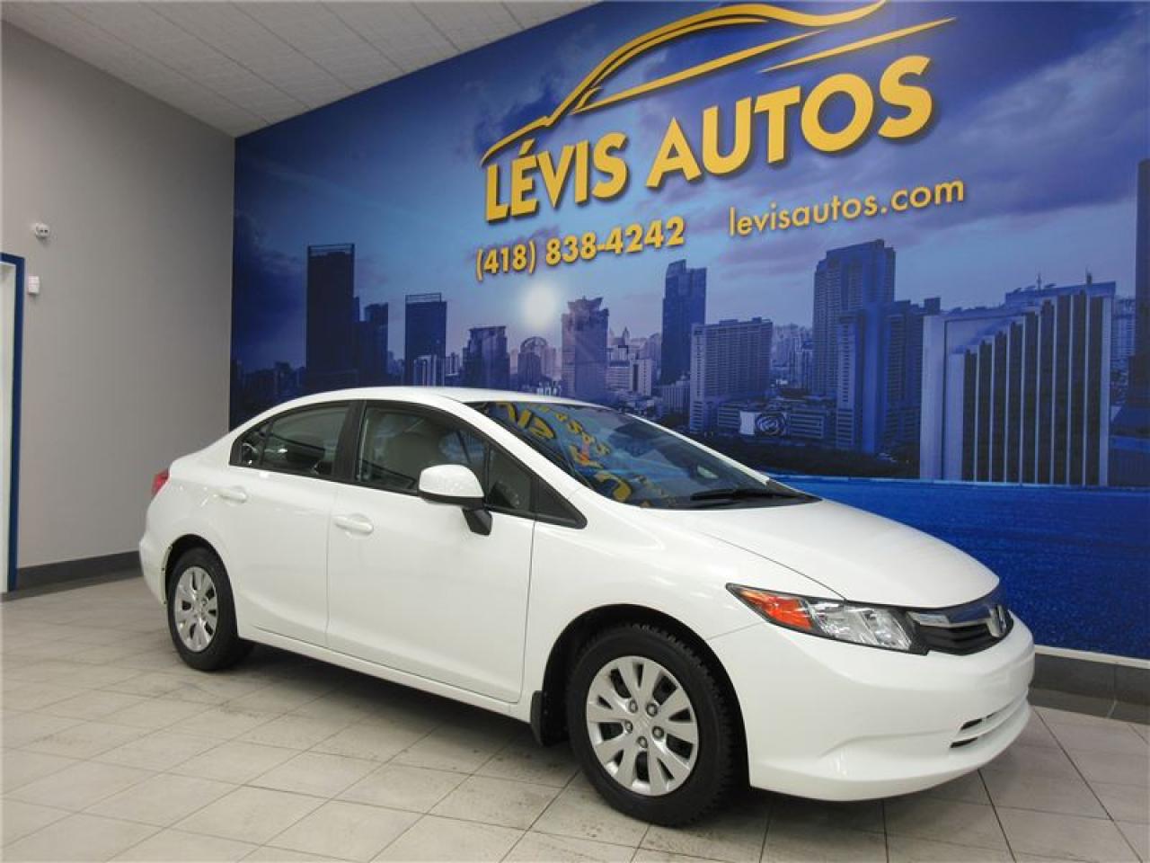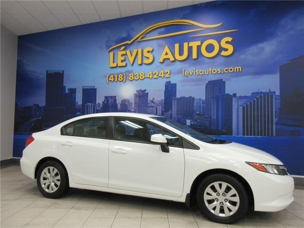 HONDA CIVIC 2012 LX AUTOMATIQUE BLANC AVEC SEULEMENT 73000 KM CERTIFIÉ (RAPPORT CARPROOF DISPONIBLE) MOTEUR 1.8 LITRES OFFRANT UNE EXCELLENTE PUISSANCE EN PLUS D'ÊTRE LE PLUS ÉCONOMIQUE DE SA CATÉGORIE. TRANSMISSION 5 VITESSES MANUELLE, ROUE D'ACIER SUR PNEUS D'HIVER TOYO EN EXCELLENTE CONDITION, MIROIRS CHAUFFANTS, BLUETOOTH, ORDINATEUR DE ROUTE, AIR-CLIMATISÉ, CRUISE CONTROL, LECTEUR CD MP3 AVEC PRISE AUXILIAIRE/USB/SIRIUS, VOLANT AJUSTABLE ET TÉLESCOPIQUE, GROUPE ÉLECTRIQUE COMPLET, RPM, FREIN ABS, TÉLÉ-VERROUILLAGE, ALARME, ANTI-PATINAGE. GARANTIE DE 3 MOIS OU 5000 KM MOTOPROPULSEUR (GARANTIE PROLONGÉ DISPONIBLE À PRIX IMBATTABLE AVEC LE CAA ET PPP) TAUX DE FINANCEMENT À PARTIR DE SEULEMENT 4.69%. VÉHICULE EXTRÊMEMENT PROPRE ET BIEN ENTRETENUE À VOIR ABSOLUMENT! POUR PLUS D'INFOS CELL:418-554-7565/418-838-4242. NOUS SOMMES SITUÉ AU 4585 BOULEVARD GUILLAUME-COUTURE LÉVIS G6W-6M6.LE PLUS GRAND CHOIX DE VÉHICULES USAGÉS À LÉVIS. AU PLAISIR DE VOUS SERVIR! VISITEZ NOTRE SITE INTERNET WWW.LEVISAUTOS.COM