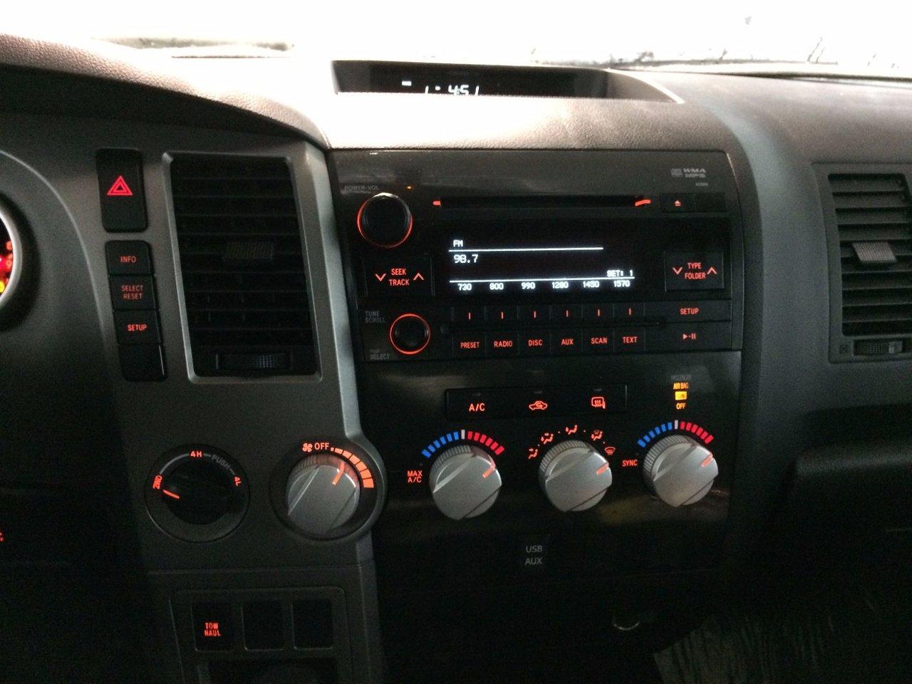 Toyota Tundra SR5 2012\n\nRégulateur de vitesse, Essuie-glaces intermittents, Anti-démarreur, Freins ABS, Contrôle de stabilité, Coussin gonflable conducteur, Coussins gonflables latéraux, Lecteur CD, Lecteur MP3, Portes électriques, Vitres électriques, Air climatisé, Lampes de lecture arrière, Volant ajustable, Tapis protecteurs, Attelage remorque, Phares automatiques, Rétroviseur électrique, Direction assistée, Rétroviseurs chauffants, Coussins gonflables arrière pour la tête, Freins à disque, Antipatinage, Verrous de sécurité pour enfants, Système de surveillance de la pression des pneus, Roue de secours - Temporaire, Climatisation\n\nPOUR LE PLUS GRAND CHOIX À UN SEUL ENDROIT, LE MEGA CENTRE DE L'USAGÉ DANS L'EST DU QUÉBEC. COUVRANT LA GRANDE RÉGION DE RIMOUSKI, MATANE, MONT-JOLI, RIVIÈRE-DU-LOUP, STE-ANNE DES MONTS, MATAPÉDIA,GASPÉSIE... CONTACTEZ-NOUS SANS FRAIS AU 1-877-864-3666 LIVRAISON PARTOUT AU QUÉBEC.
