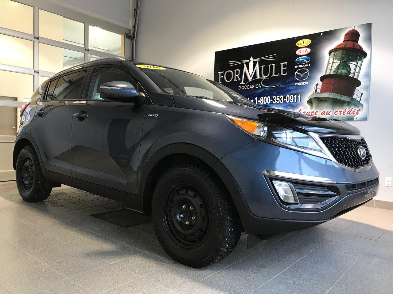 Kia Sportage LX 2016\n\nRégulateur de vitesse, Essuie-glaces intermittents, Anti-démarreur, Freins ABS, Contrôle de stabilité, Coussin gonflable conducteur, Coussins gonflables latéraux, Lecteur CD, Lecteur MP3, Portes électriques, Vitres électriques, Air climatisé, Sièges chauffants, Volant ajustable, Tapis protecteurs, Phares automatiques, Rétroviseur électrique, Direction assistée, Rétroviseurs chauffants, Coussins gonflables arrière pour la tête, Sièges tissu, Freins à disque, Sièges chauffants - Avant, Antipatinage, Phares antibrouillards, Verrous de sécurité pour enfants, Sièges baquets, Technologie Bluetooth intégrée, Aluminium, Climatisation\n\nPOUR LE PLUS GRAND CHOIX À UN SEUL ENDROIT, LE MEGA CENTRE DE L'USAGÉ DANS L'EST DU QUÉBEC. COUVRANT LA GRANDE RÉGION DE RIMOUSKI, MATANE, MONT-JOLI, RIVIÈRE-DU-LOUP, STE-ANNE DES MONTS, MATAPÉDIA,GASPÉSIE... CONTACTEZ-NOUS SANS FRAIS AU 1-877-864-3666 LIVRAISON PARTOUT AU QUÉBEC.
