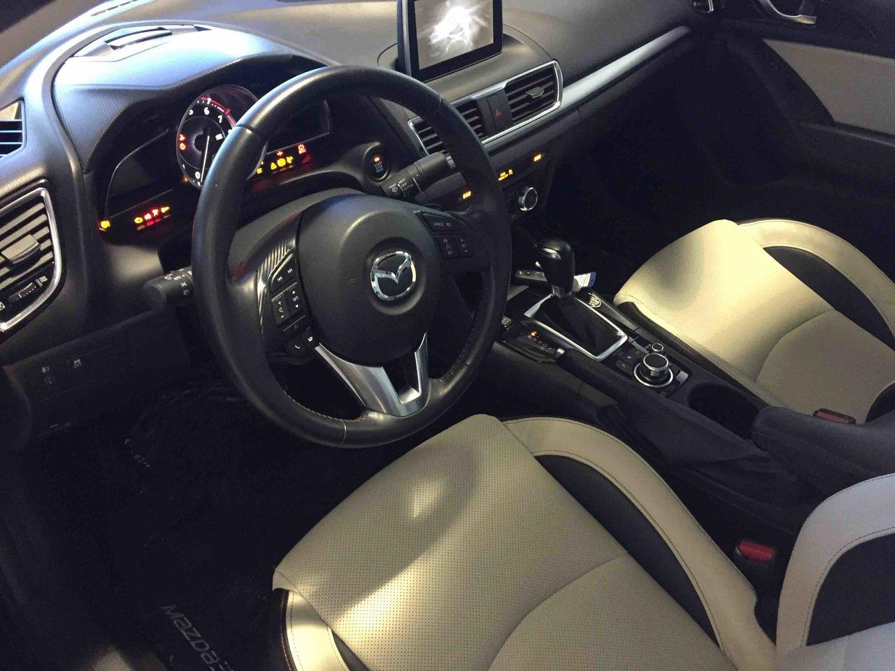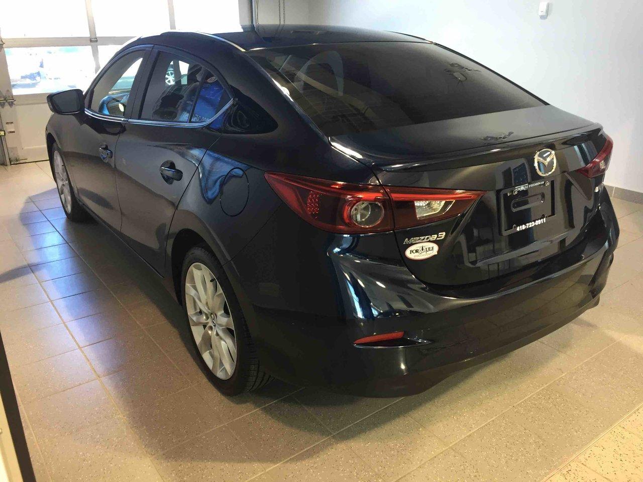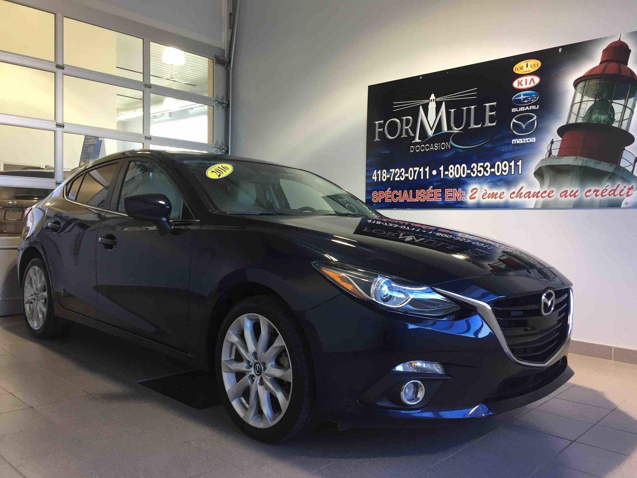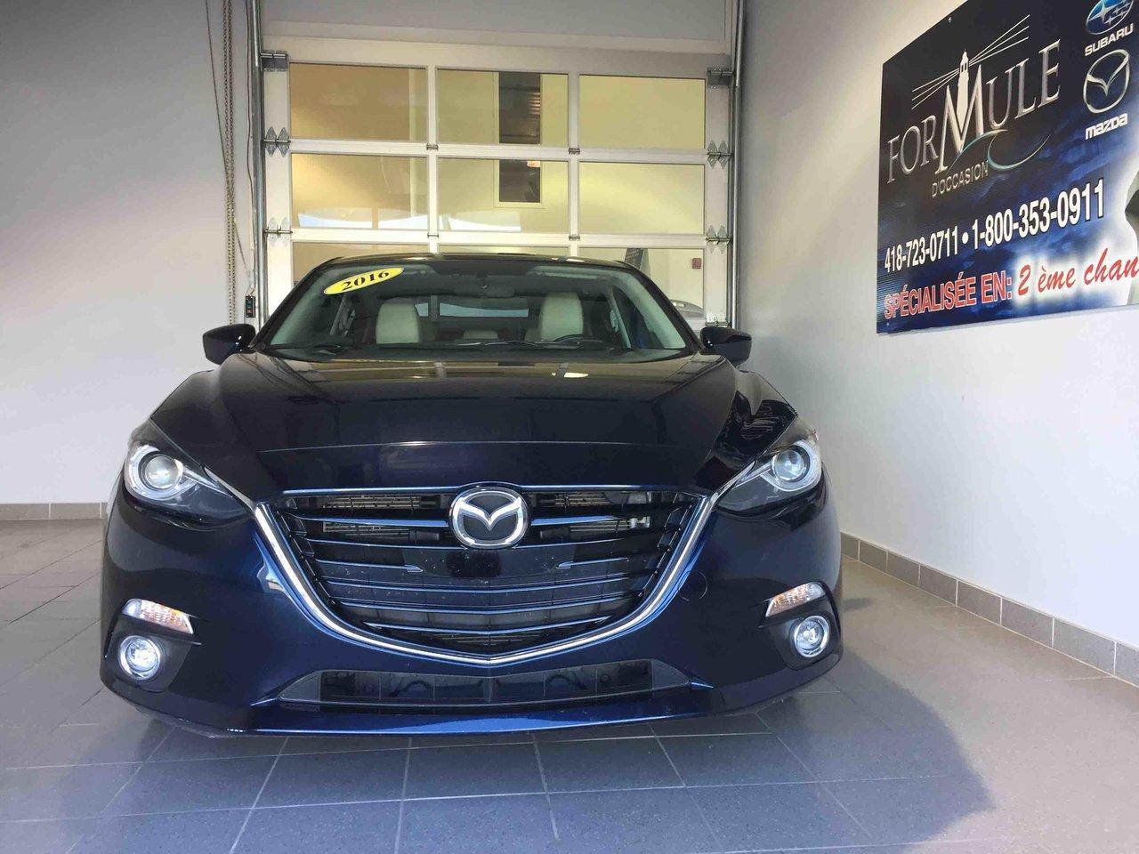 Mazda Mazda3 GT 2016\n\nToit ouvrant, Lecteur CD, Portes électriques, Sièges électriques, Vitres électriques, Air climatisé, Intérieur en cuir, Sièges chauffants, Caméra de recul, Jantes en alliage\n\nPOUR LE PLUS GRAND CHOIX À UN SEUL ENDROIT, LE MEGA CENTRE DE L'USAGÉ DANS L'EST DU QUÉBEC. COUVRANT LA GRANDE RÉGION DE RIMOUSKI, MATANE, MONT-JOLI, RIVIÈRE-DU-LOUP, STE-ANNE DES MONTS, MATAPÉDIA,GASPÉSIE... CONTACTEZ-NOUS SANS FRAIS AU 1-877-864-3666 LIVRAISON PARTOUT AU QUÉBEC.