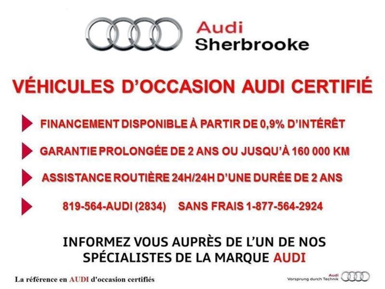DIFFERENTIEL QUATTRO SPORT, SUSPENSION MAGNÉTIQUE, NAVIGATION, CAMERA DE RECUL, DETECTEUR D'ANGLE MORT!!! *** MAINTENANT OUVERT LE SAMEDI *** Plusieurs véhicules de toutes marques en inventaire prêts pour une prise de possession rapide. De plus, Audi Sherbrooke vous offre le plus grand choix de véhicules d'occasion Audi en Estrie. Tous nos véhicules d'occasion sont minutieusement inspectés et réparés avec soin par nos techniciens certifiés *** FINANCEMENT À PARTIR DE 0.9% *** Nous vous donnons le meilleur prix pour votre échange, spécialistes sur place, 1iere, 2ieme ou 3ieme chance au crédit. Vous pouvez nous rejoindre en tout temps, notre équipe professionnelle et certifiée saura vous offrir une expérience d'achat personnalisée pour l'achat de votre prochain véhicule d'occasion certifié. Un rapport CarProof vous est remis sur demande lors de l'achat. Venez nous rencontrer 4319 Blvd Bourque, Sherbrooke 1 (855) 781-7889 ou visitez www.audisherbrooke.com/usage pour l'inventaire complet!!!!