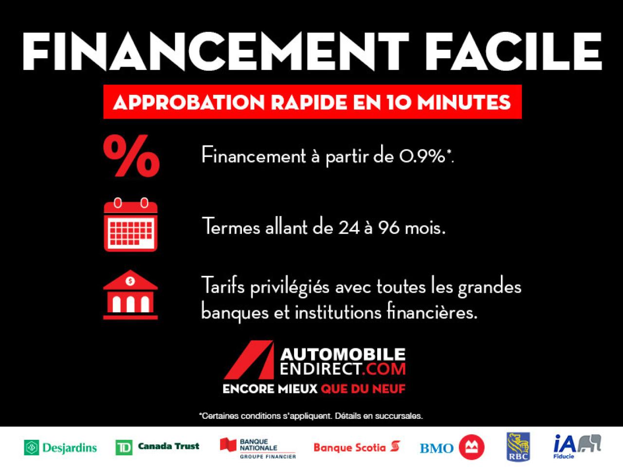 BALANCE DE GARANTIE AIR CLIMATISE TOIT CUIR MAGS PORTE VITRE MIROIR ELECTRIQUE BLUETOOTH REGULATEUR DE VITESSE SIEGES CHAUFFANTS 1200 véhicules - Livraison 24h - Financement facile à partir de 0.9% - Ouvert 7 jours / 5 soirs Automobile en Direct.com c'est le plus gros inventaire de véhicules d'occasion, avec toutes les marques et tous les modèles offert au meilleur prix. C'est aussi profiter de nombreux avantages exclusifs et d'une gamme complète de services offerts en un seul endroit: - Livraison rapide en moins de 24h. - Financement facile sur place à partir de 0.9%. - 2ième et 3ième chance au crédit 100% approuvée. - Allocation incroyable pour vente et échange de véhicule sur place. Au delà des véhicules, Automobile en Direct.com, c'est une équipe de 150 passionnés qui vous accueille dans une ambiance sincère, amicale et courtoise. Il n'y a pas de fla-fla ou de pression inutile. Vous vendez votre véhicule? Nous achetons au meilleur prix même si vous n'achetez pas avec nous. Passez nous voir en magasin ou prenez rendez-vous pour un essai routier. Faites vite. Chaque véhicule est unique. Ce véhicule ne correspond pas exactement à ce que vous recherchez? Visitez Automobile en Direct.com, nous avons accès à toutes les marques et tous les modèles au meilleur prix garanti. Automobile en Direct.com - Encore mieux que du neuf. Automobile en Direct.com is the largest used car inventory with all makes and models offered at the lowest price. They also offer access to exclusive offers and services in one location: - Fast delivery in less than 24 hours. - Easy financing starting at 0.9%. - 2nd and 3rd credit chance 100% approved. - Best value offered for your trade-in. Beyond the vehicles, Automobile en Direct.com is a team of 150 pasionnate people that welcome you in a simple, friendly and nice atmosphere. There is no run-around or pressure when you deal with us. Are you selling your vehicle? We buy at the best price, even if you don't buy with us. Visit us in store or make an appointment for a test drive. Hurry hup, every vehicle is unique. This vehicle does not match exactly with what you want? Visit us at Automobile en Direct.com, we have access to all makes and vehicle at the lowest price guaranteed Automobile en Direct.com - Even better than new.