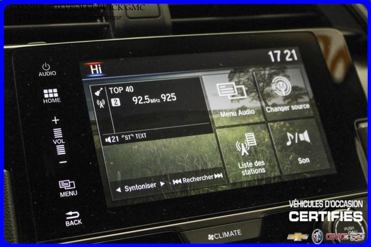 JAMAIS ACCIDENTÉ + ÉCRAN TACTILE AILERON JUPES 4 PNEUS D'ÉTÉ 4 PNEUS D'HIVER + caméra de recul + sièges chauffants + air climatisé + commandes vocales + commandes audio au volant + régulateur de vitesse + groupe électrique Garantie jusqu'au 30 Novembre 2021 ou 100 000 kilomètres À voir absolument : un superbe HONDA CIVIC 2017, à vendre chez GRENIER OCCASION CHEVROLET BUICK GMC NOUS SOMMES OUVERT 7 JOURS PAR SEMAINE POUR MIEUX VOUS SERVIR 1275 CARRÉ MASSON , TERREBONNE Nous sommes situé à 20 minutes Saint-Eustache/ Saint-Jérôme/Laval/Repentigny/montréal. Programme de véhicules d' occasion certifiés. Rapport Carproof disponible gratuitement. Inspection en 150 points. Le prix affiché inclus un rabais de 500 $ avec un financement.